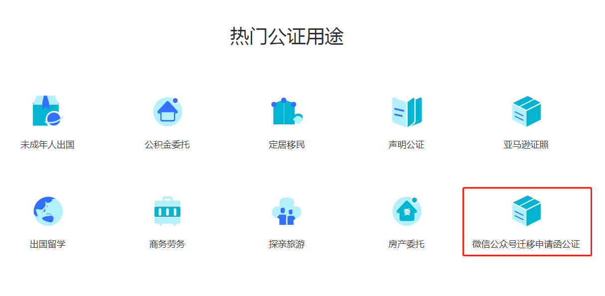 1、打开公证云平台(,在牛彩网正版首页找到“微信公众号迁移申请函公证”,如下图所示: